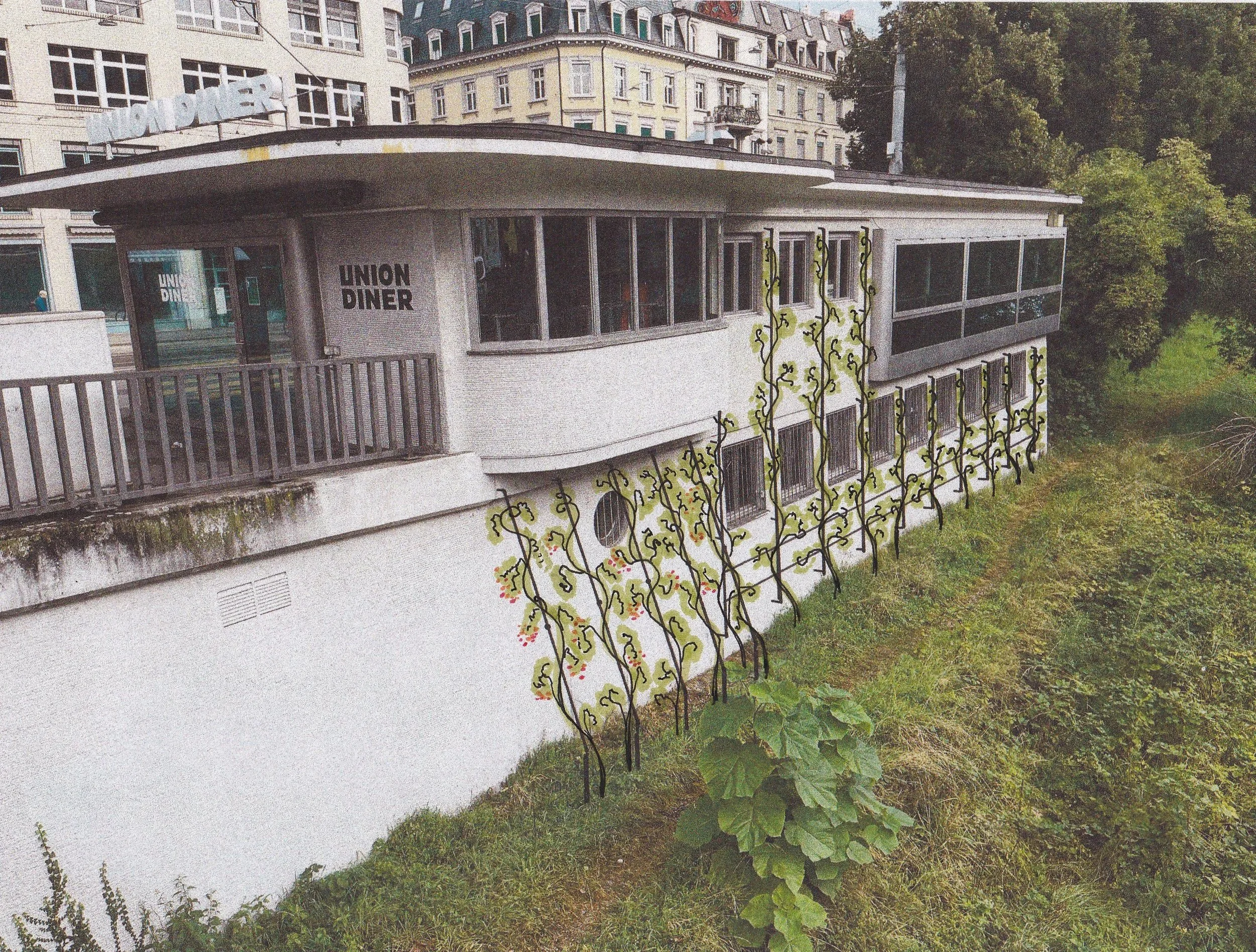 Konzept und Vorprojektskizzen für eine Genossenschaft in Zürich. Bodengebunde Vertikalbegrünung an Rankhilfe. (2023)