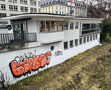 Der markante Flachbau direkt an der Sihl aus den 1930er Jahren war ursprünglich eine Tramwartehalle und wird heute als Gastrobetrieb genutzt.